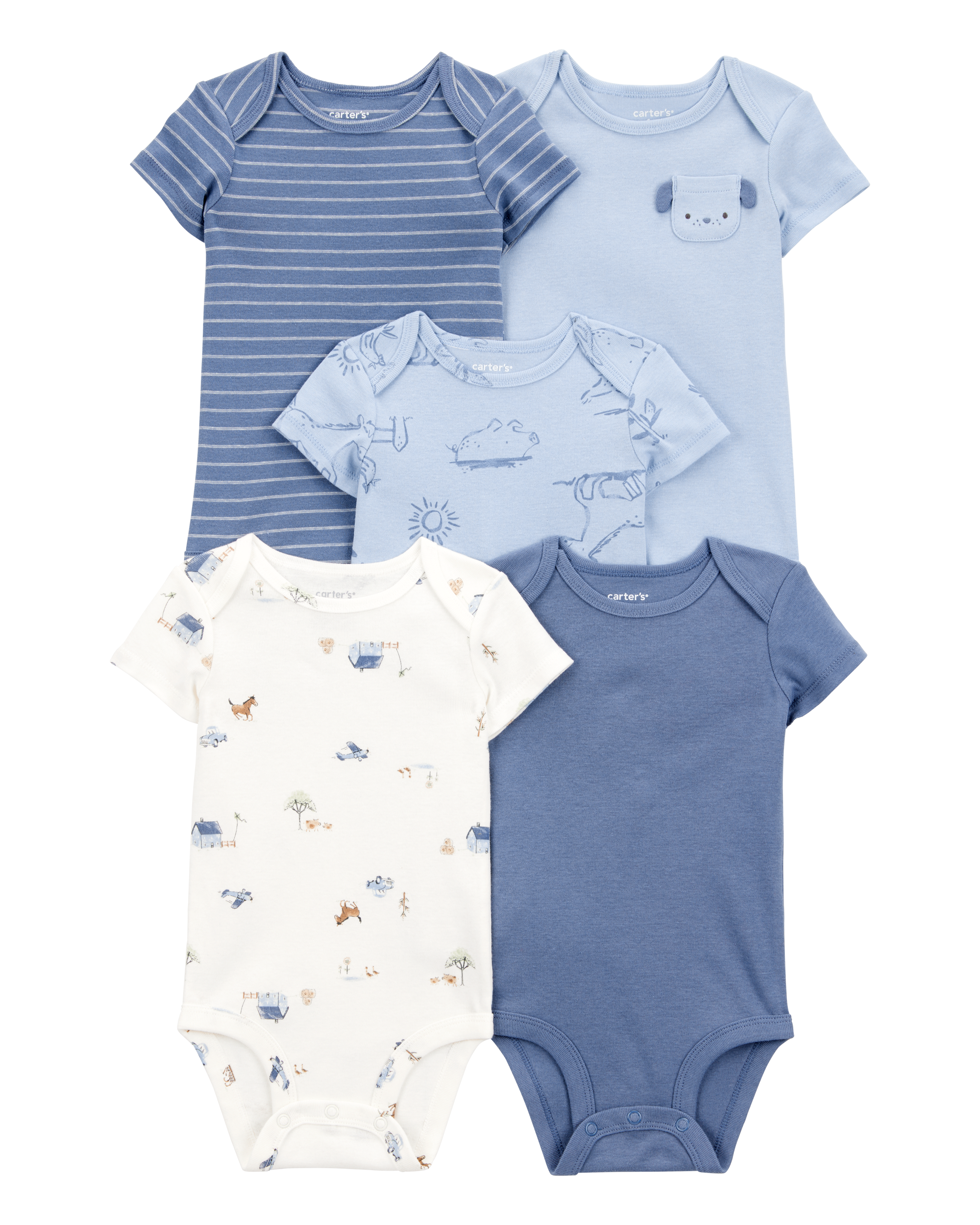 Set bodića jedinstvenog dizajna s okruglim ovratnikom, kratkim rukavima i kopčanjem pritisnim gumbom na donjem dijelu.